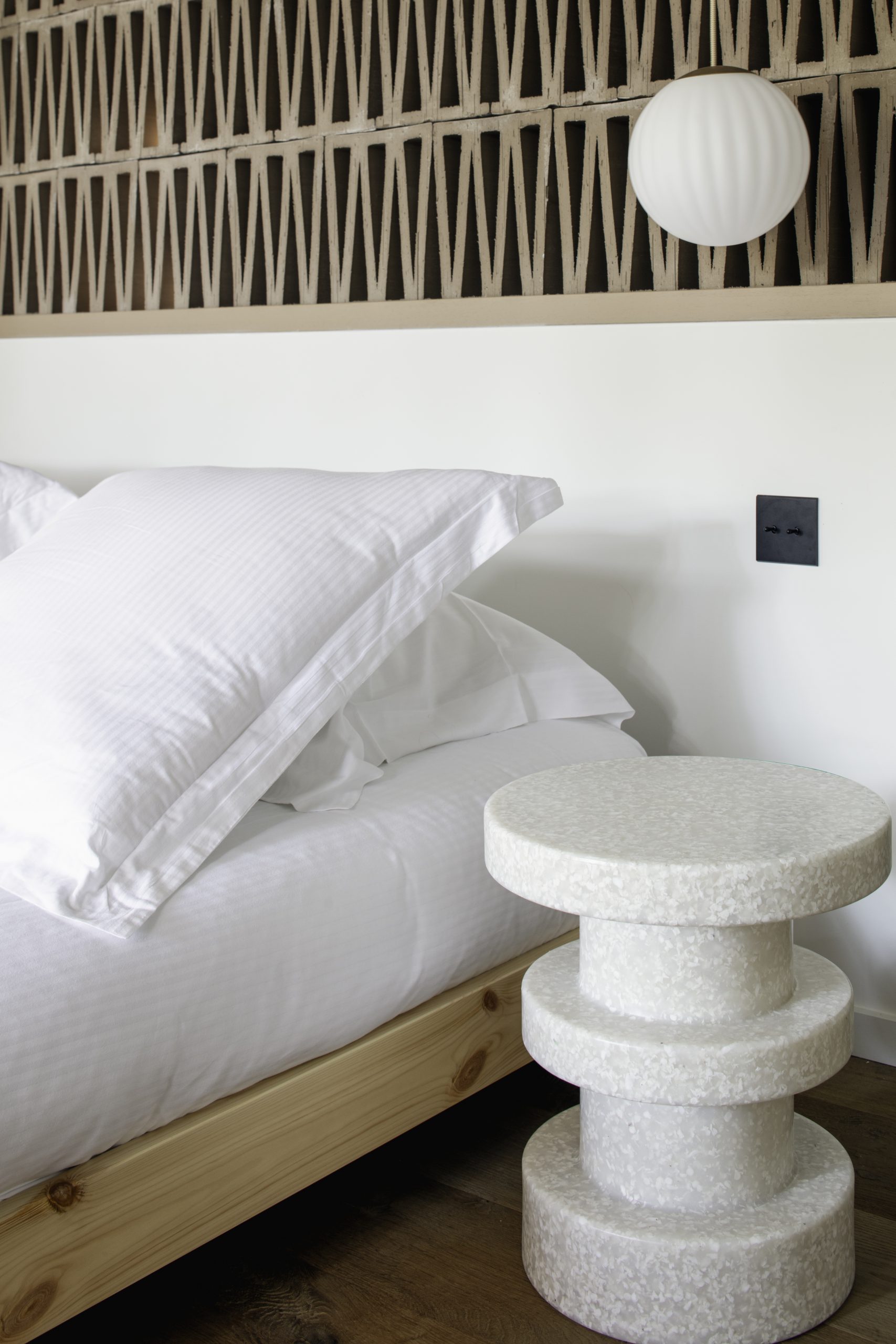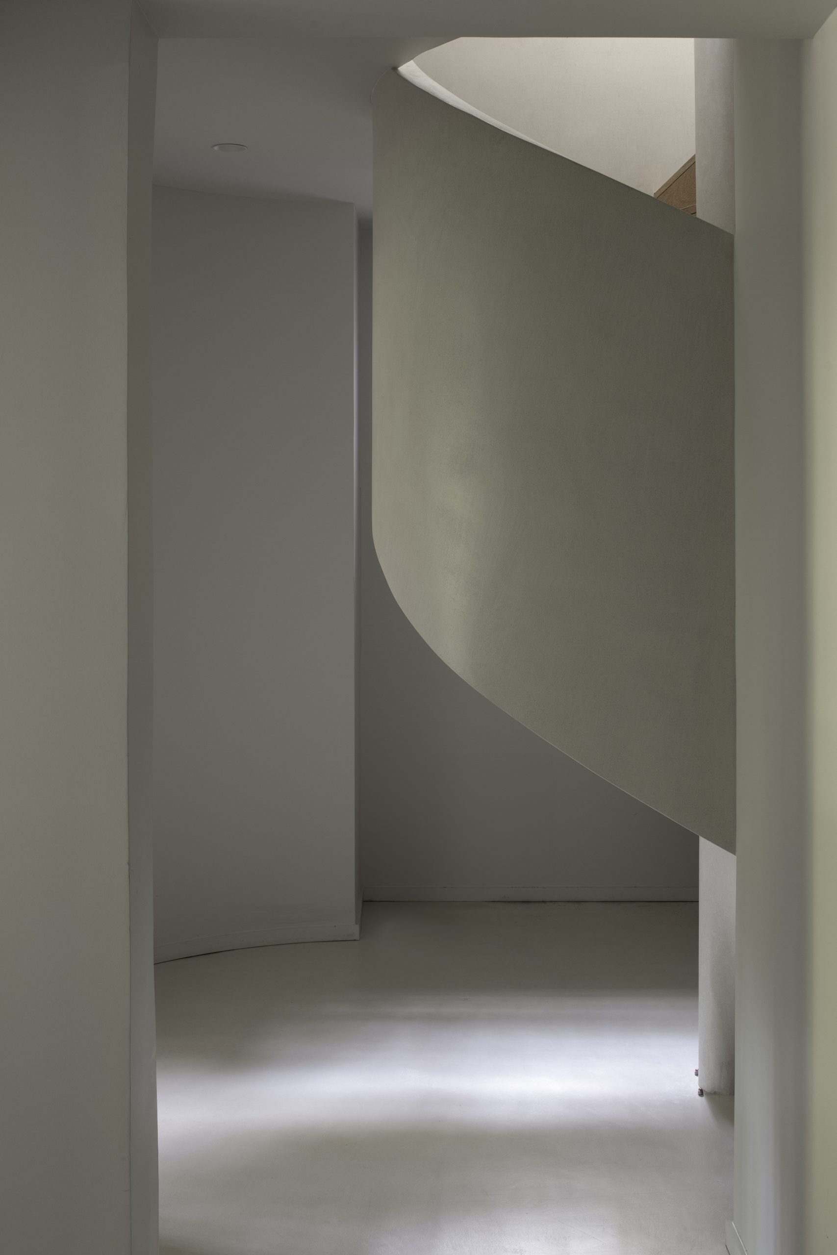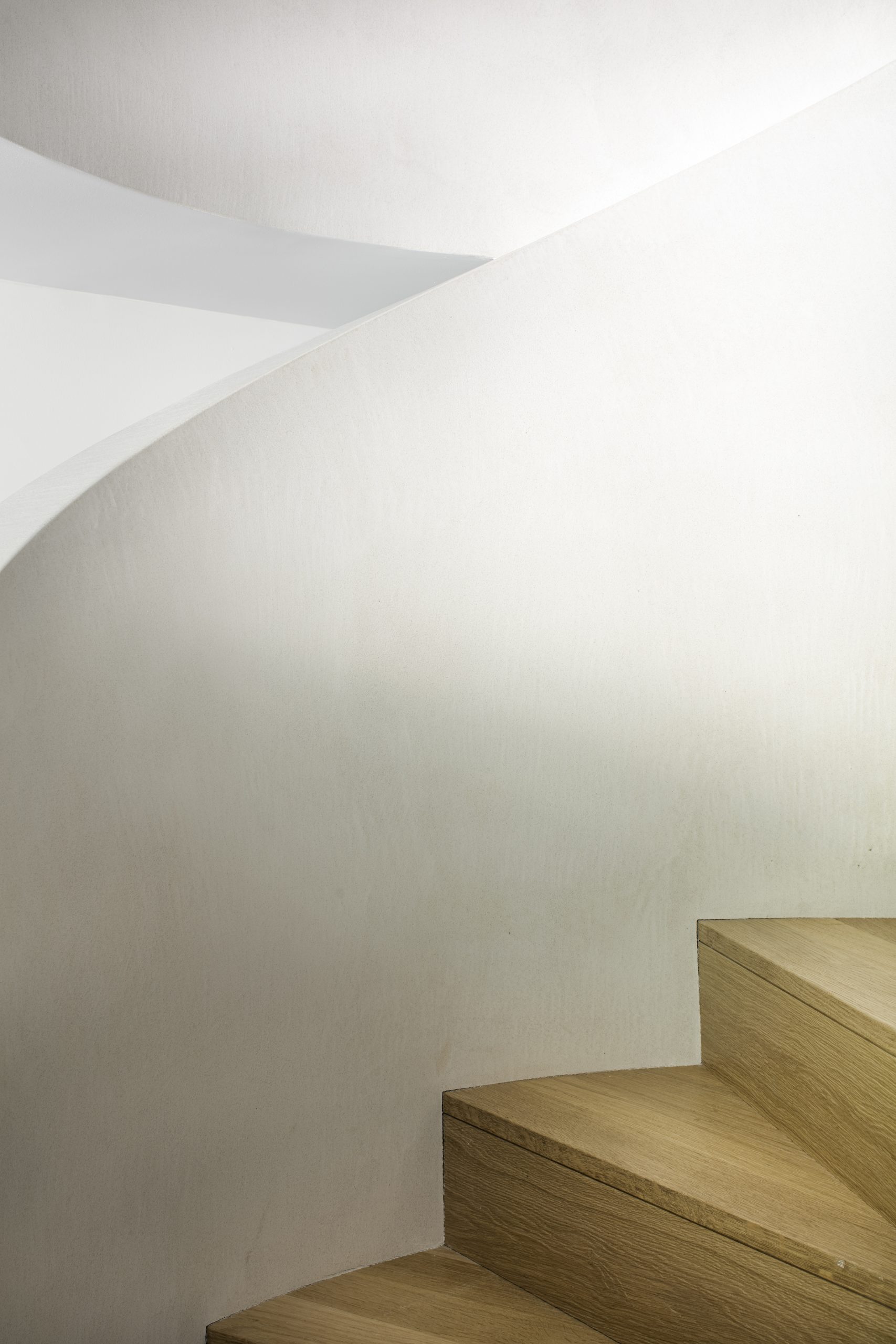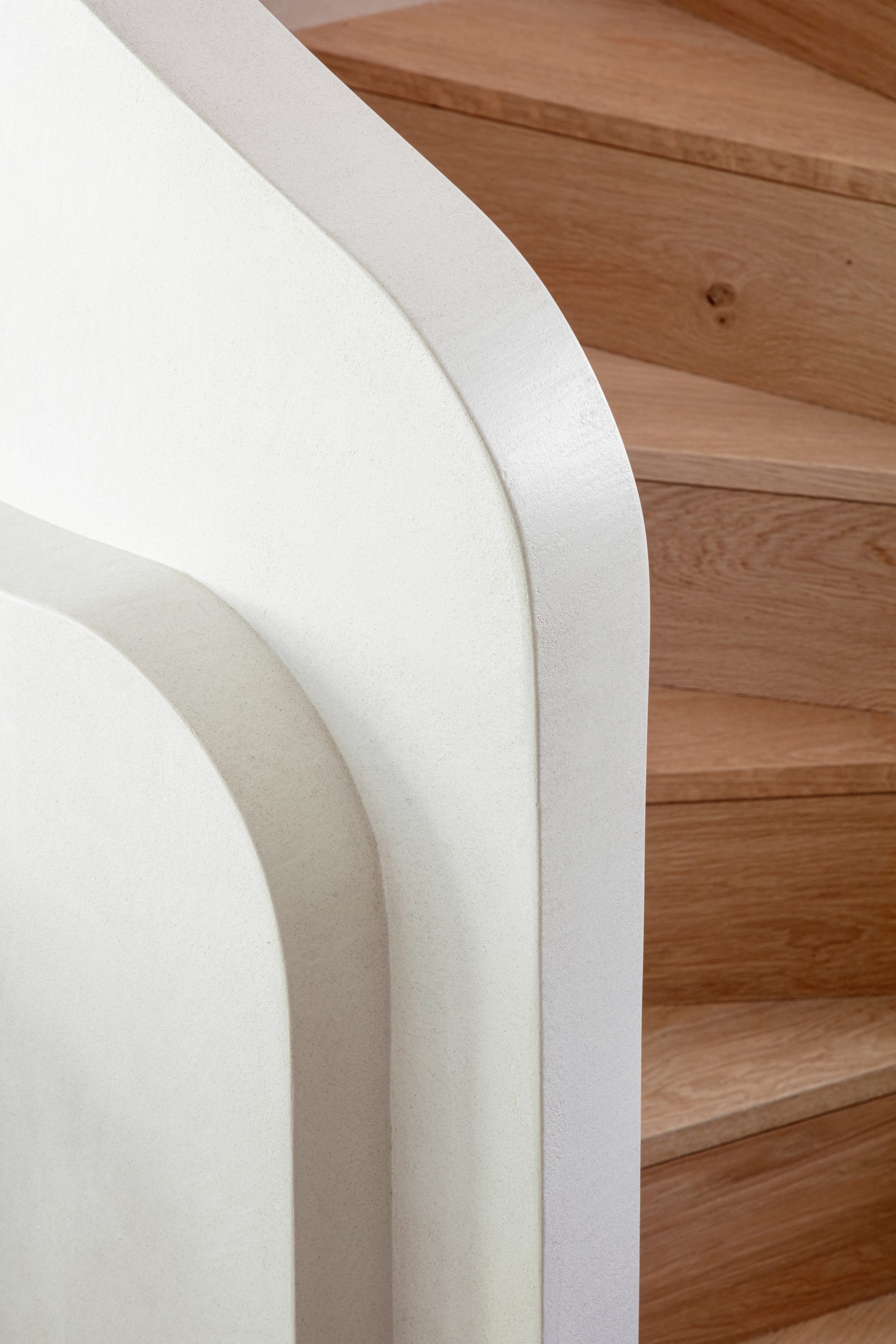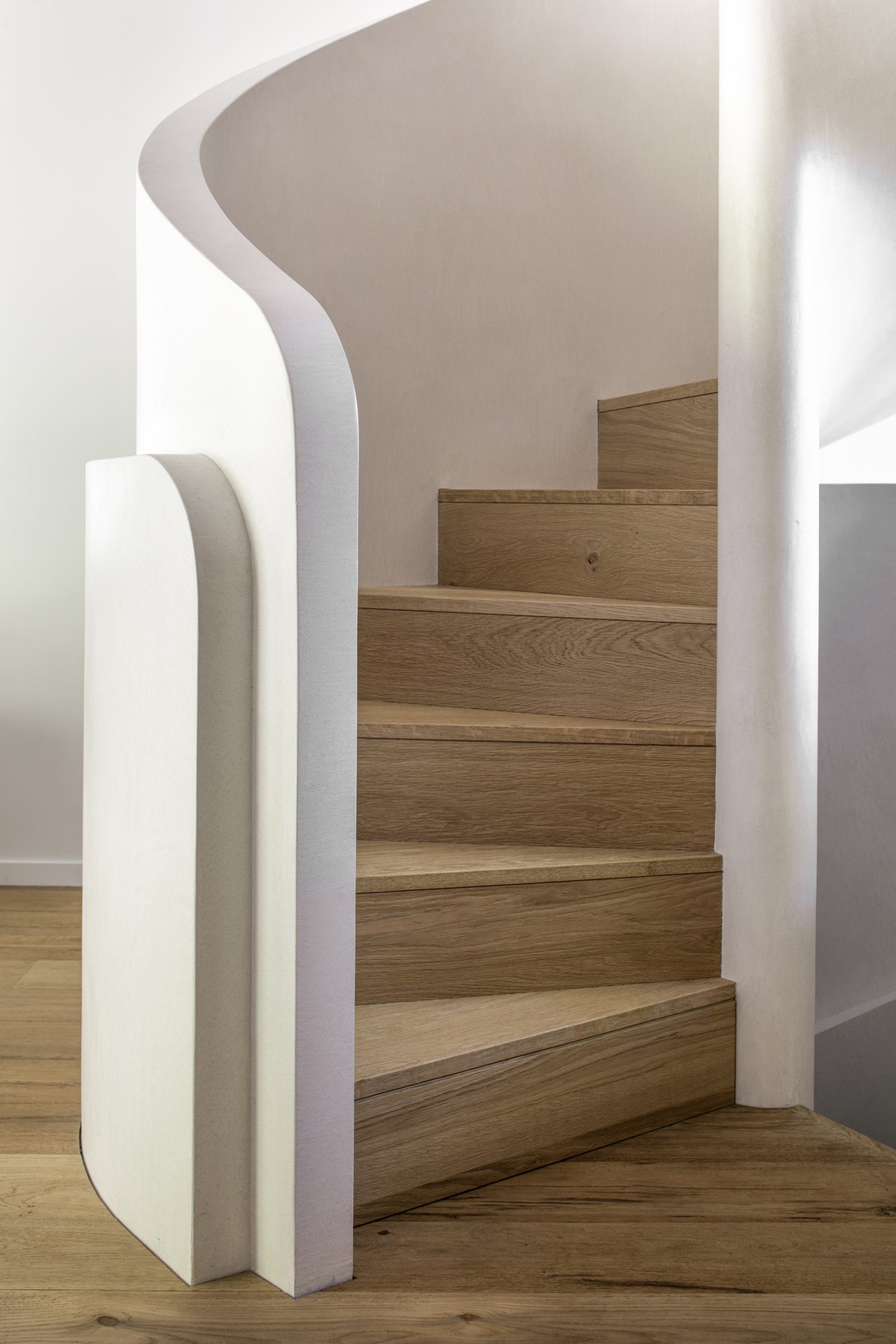 L’escalier, travaillé comme un élément architectural fort, structure les circulations et anime l’intérieur.