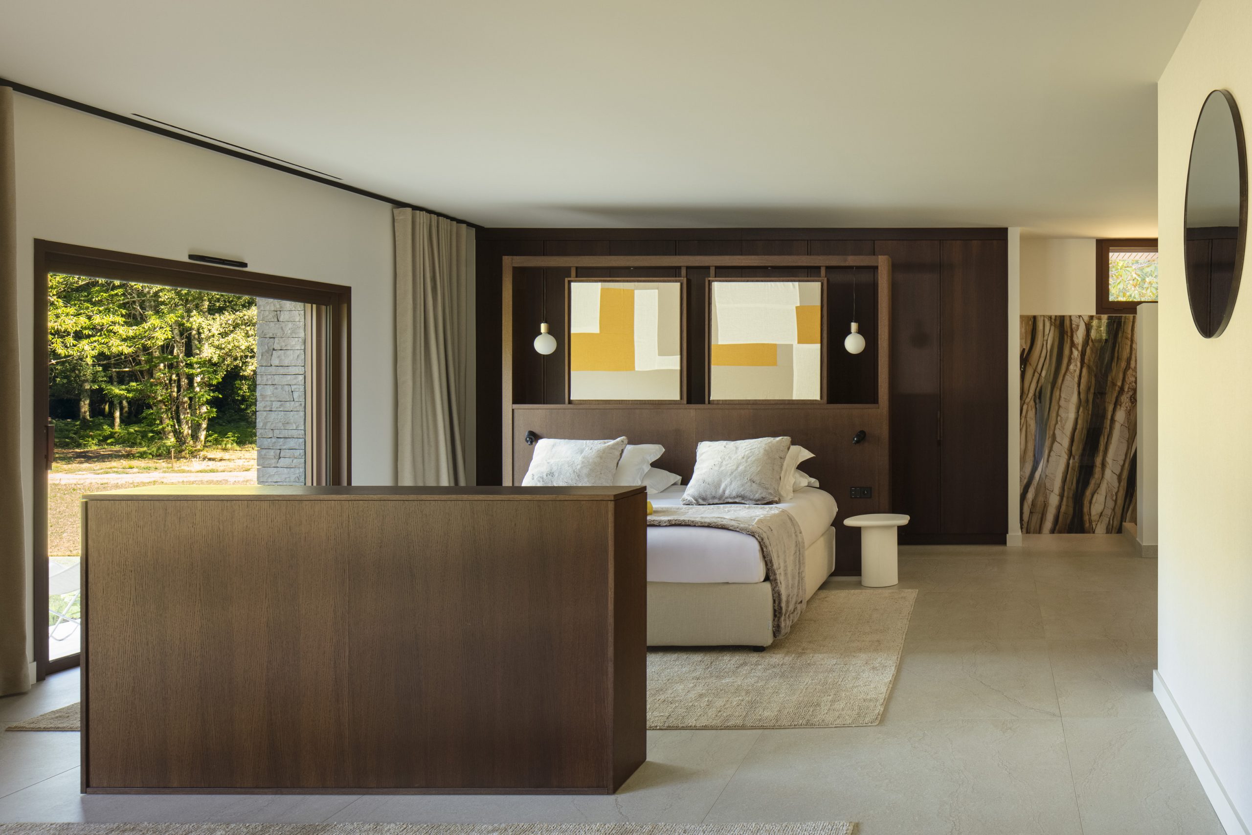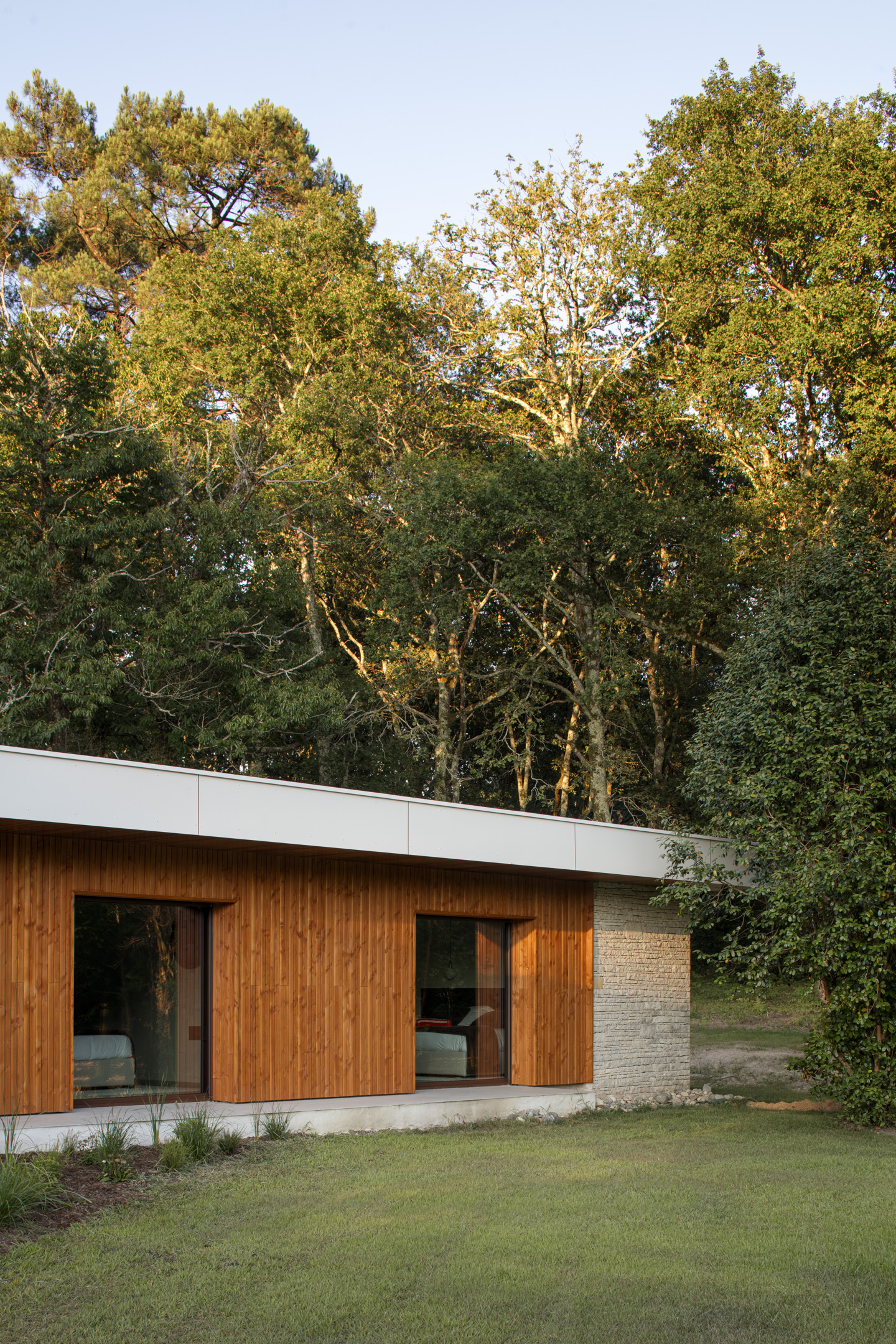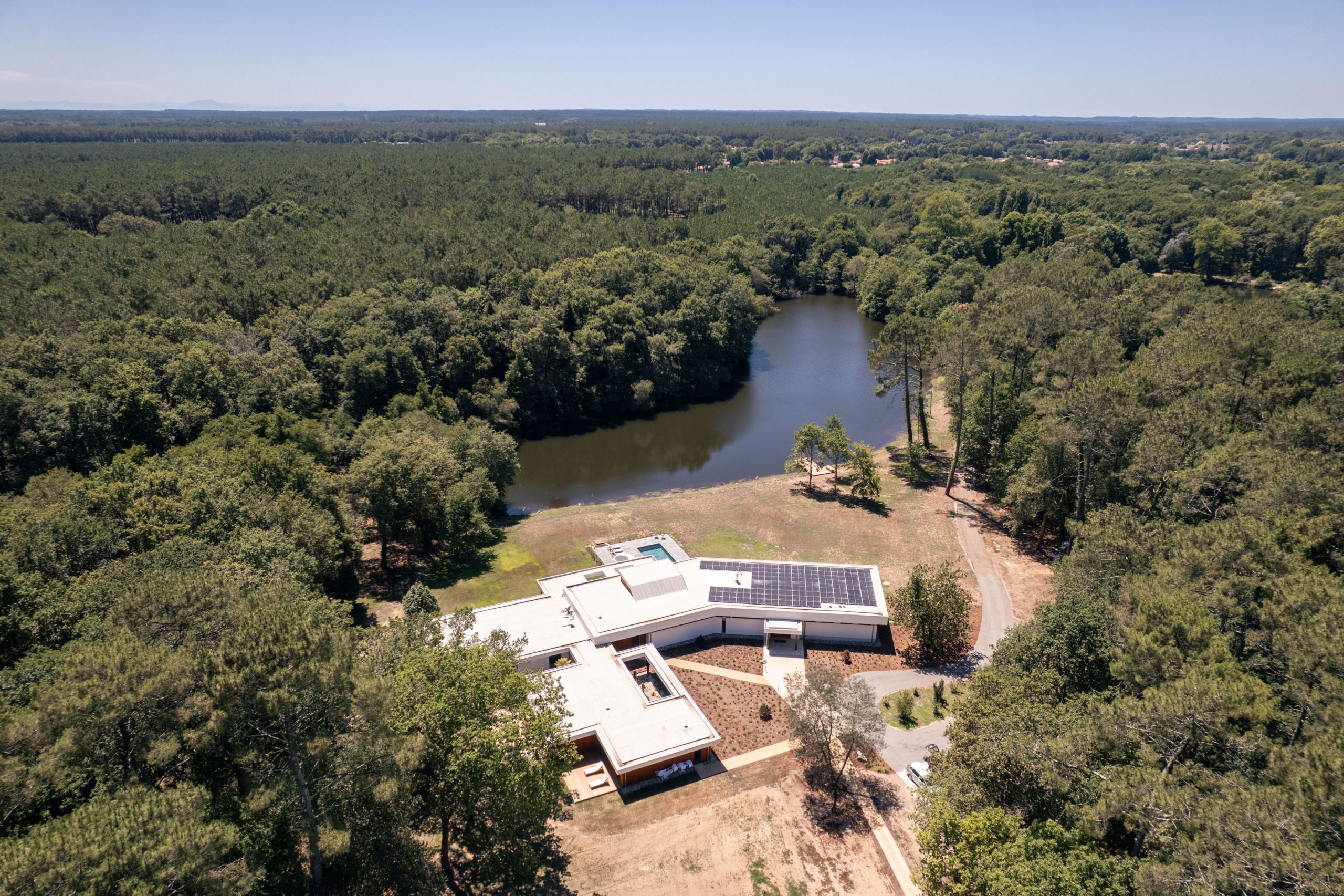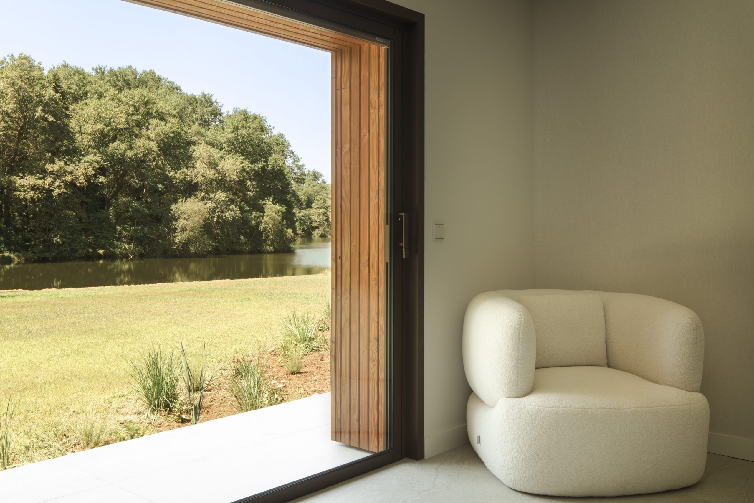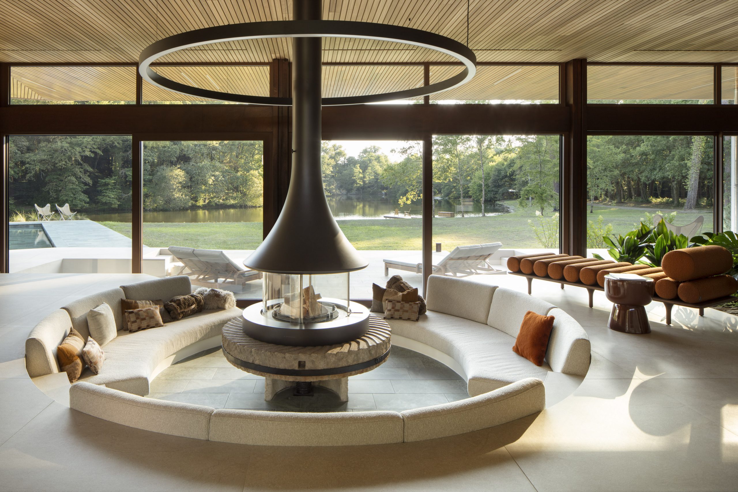 Le projet combine volumes ouverts, matériaux nobles et confort contemporain avec de grandes ouvertures sur la nature environnante.