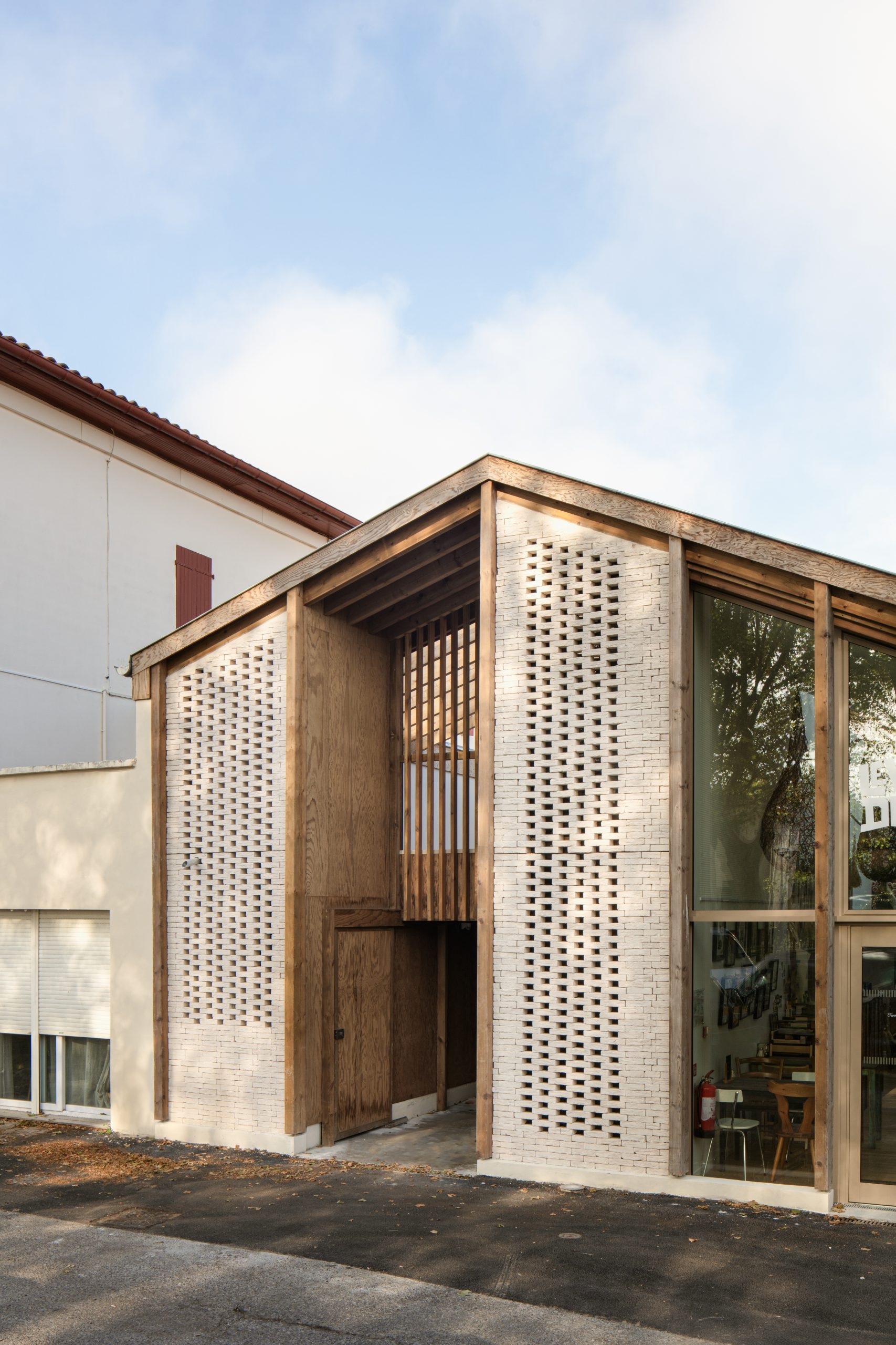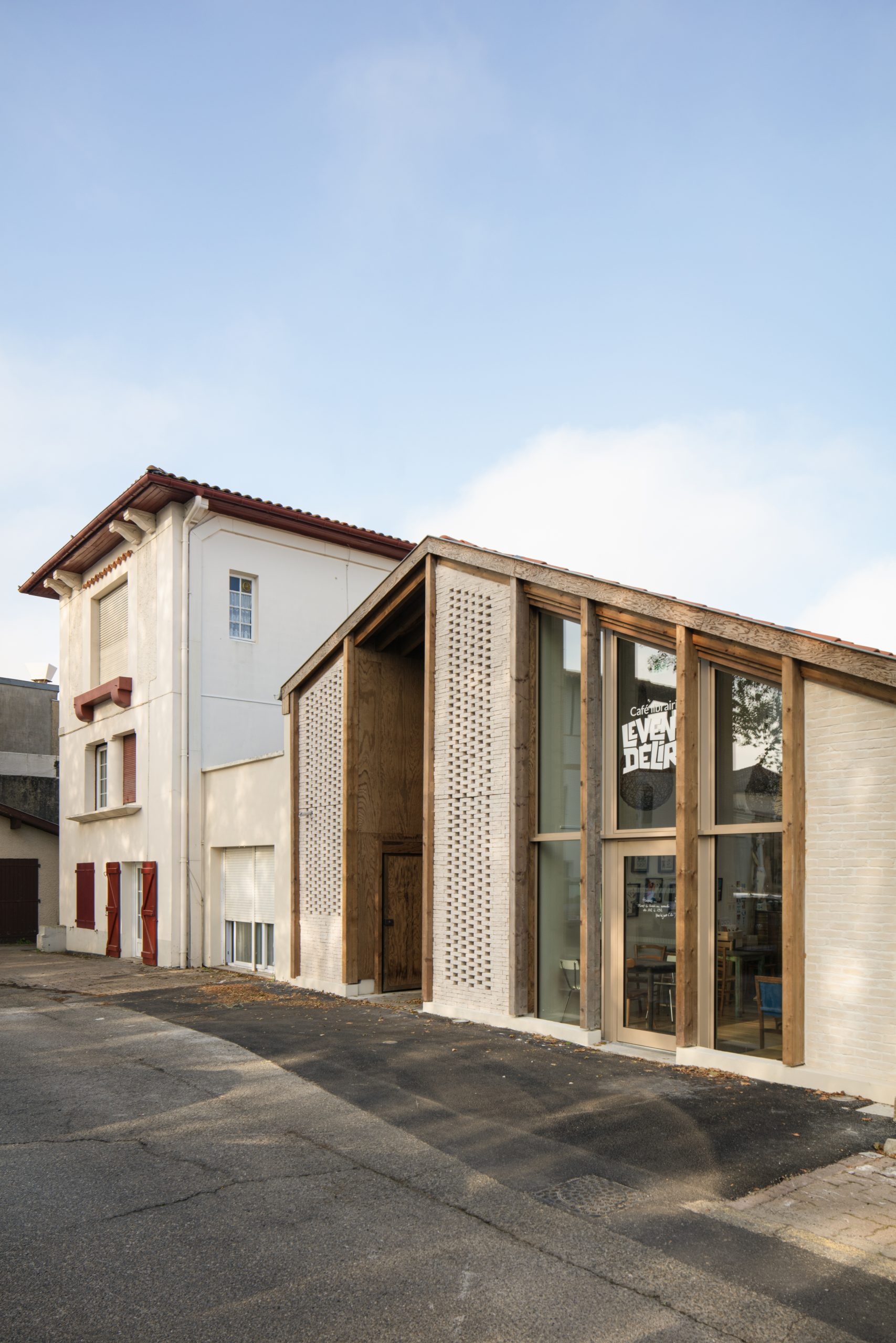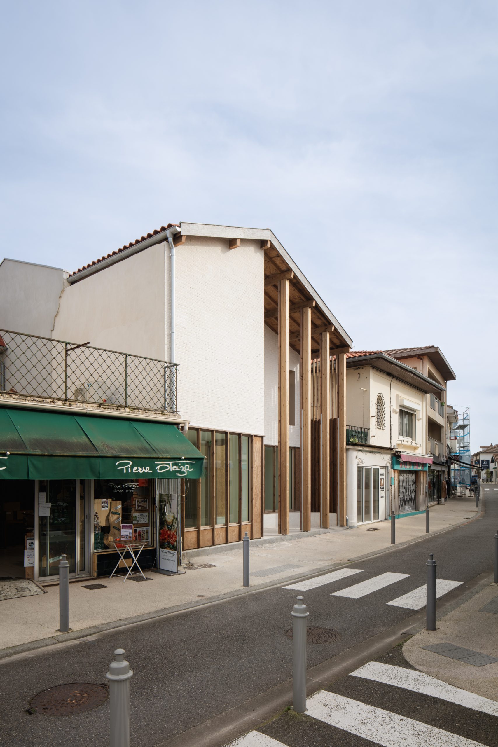 Ancien commerce de proximité, le bâtiment a été entièrement réinvesti pour accueillir la librairie Vent Délire à Capbreton et un logement à l’étage supérieur.